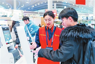 机场工作人员为旅客提供服务。