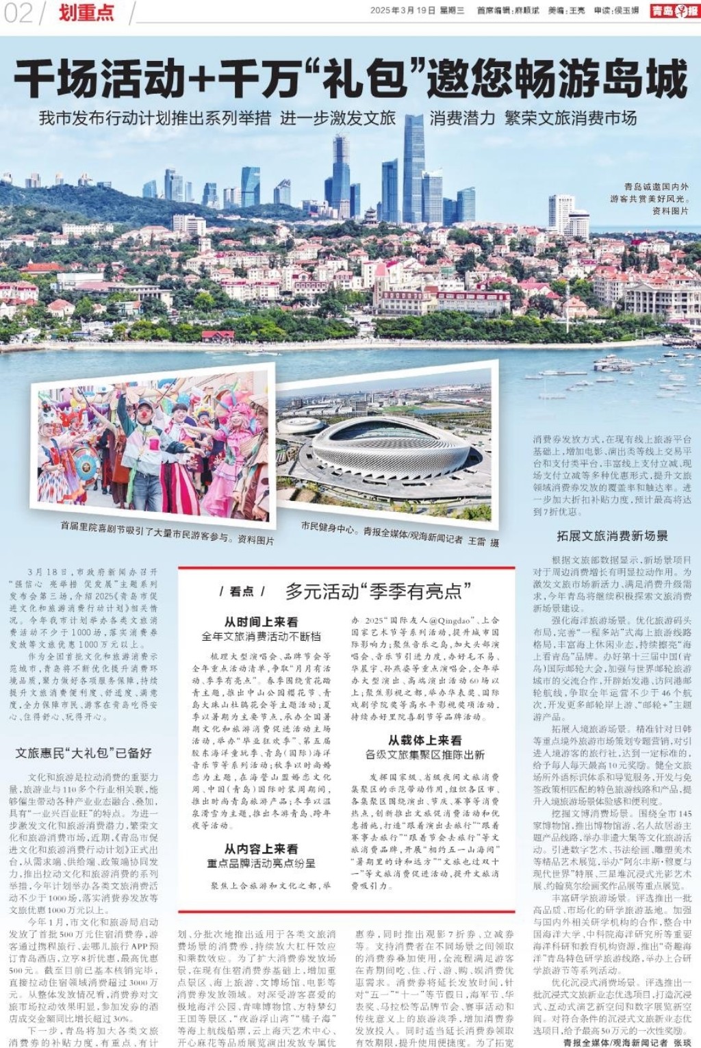 文化和旅游是拉动消费的重要力量,旅游业与110多个行业相关联,能够催生带动各种产业业态融合、叠加,具有“一业兴百业旺”的特点。为进一步激发文化和旅游消费潜力,繁荣文化和旅游消费市场,近期,《青岛市促进文化和旅游消费行动计划》正式出台,从需求端、供给端、政策端协同发力,推出拉动文化和旅游消费的系列举措,今年计划举办各类文旅消费活动不少于1000场,落实消费券发放等文旅优惠1000万元以上。