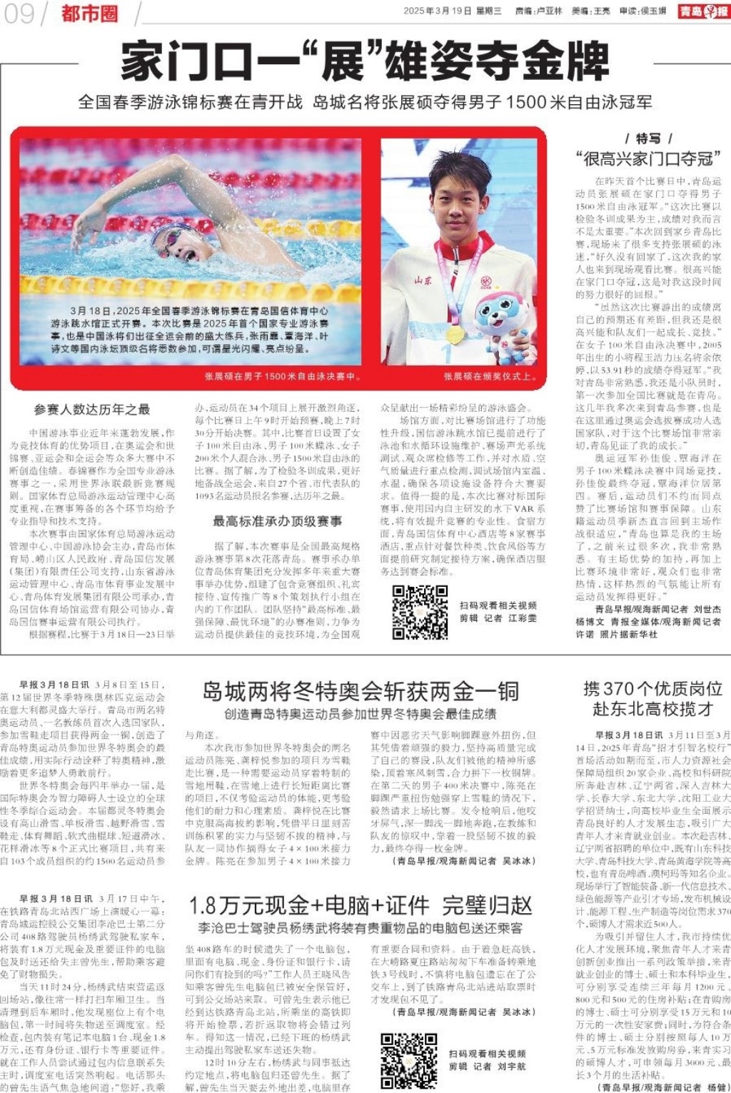 在昨天首个比赛日中,青岛运动员张展硕在家门口夺得男子1500米自由泳冠军。“这次比赛以检验冬训成果为主,成绩对我而言不是太重要。”本次回到家乡青岛比赛,现场来了很多支持张展硕的泳迷,“好久没有回家了,这次我的家人也来到现场观看比赛。很高兴能在家门口夺冠,这是对我这段时间的努力很好的回报。”