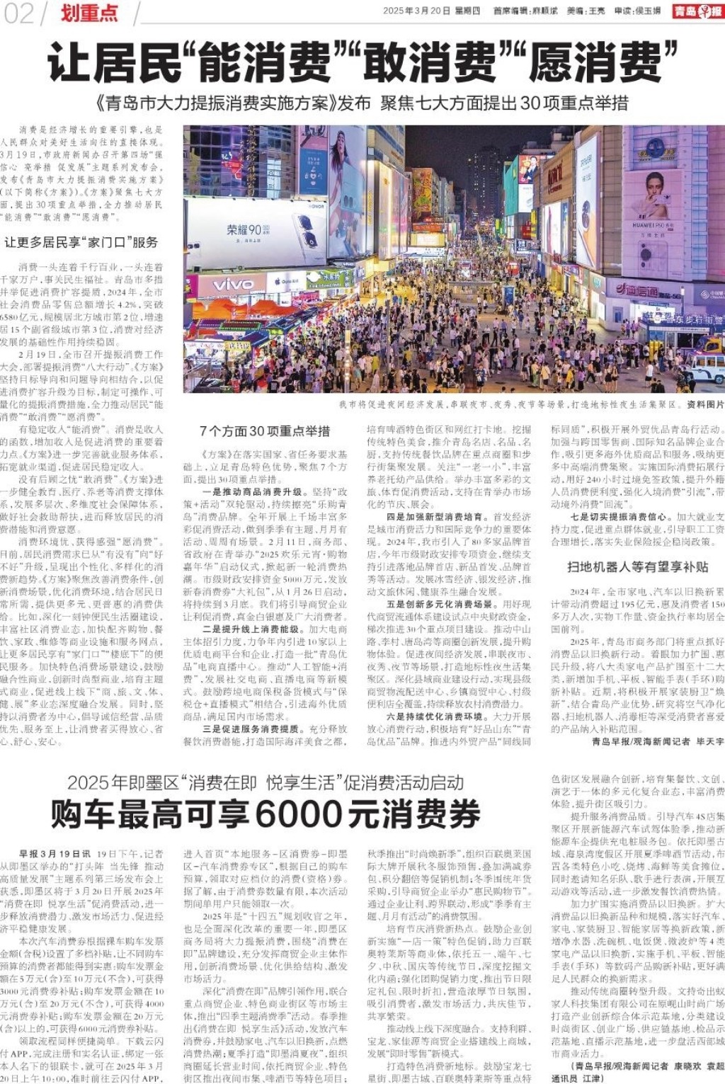 一是推动商品消费升级。坚持“政策+活动”双轮驱动,持续擦亮“乐购青岛”消费品牌。全年开展上千场丰富多彩促消费活动,做到季季有主题、月月有活动、周周有场景。2月11日,商务部、省政府在青举办“2025欢乐元宵·购物嘉年华”启动仪式,掀起新一轮消费热潮。市级财政安排资金5000万元,发放新春消费券“大礼包”,从1月26日启动,将持续到3月底。我们将引导商贸企业让利促消费,真金白银惠及广大消费者。