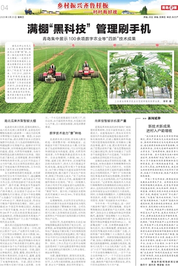 南瓜北种让木瓜又大又甜,生物菌剂焖棚技术让旧棚“焕”新,水肥一体化技术既节水降本又增效……走进位于胶州市胶东街道的上合清水湾数字农业示范园(以下简称清水湾示范园),“科技范”扑面而来。3月19日,2025年青岛市现代设施农业“四新”引领观摩暨全市农技推广工作会议在胶州举行,20余家涉农企业的新品种、新技术、新模式、新装备同台亮相,集中展示数字农业等新技术成果100余项。