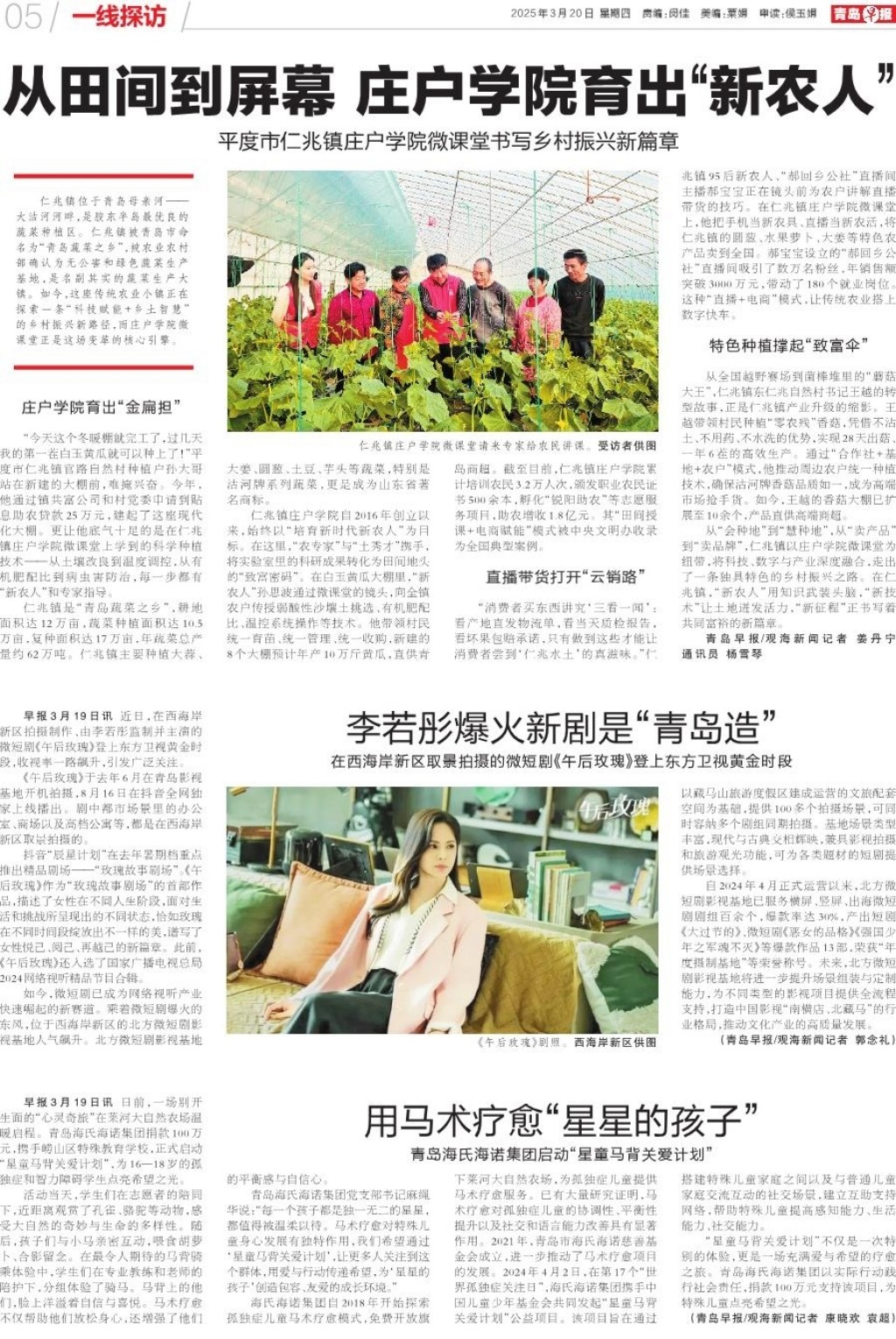 仁兆镇庄户学院自2016年创立以来,始终以“培育新时代新农人”为目标。在这里,“农专家”与“土秀才”携手,将实验室里的科研成果转化为田间地头的“致富密码”。在白玉黄瓜大棚里,“新农人”孙思波通过微课堂的镜头,向全镇农户传授弱酸性沙壤土挑选、有机肥配比、温控系统操作等技术。他带领村民统一育苗、统一管理、统一收购,新建的8个大棚预计年产10万斤黄瓜,直供青岛商超。截至目前,仁兆镇庄户学院累计培训农民3.2万人次,颁发职业农民证书500余本,孵化“锐阳助农”等志愿服务项目,助农增收1.8亿元。其“田间授课+电商赋能”模式被中央文明办收录为全国典型案例。
