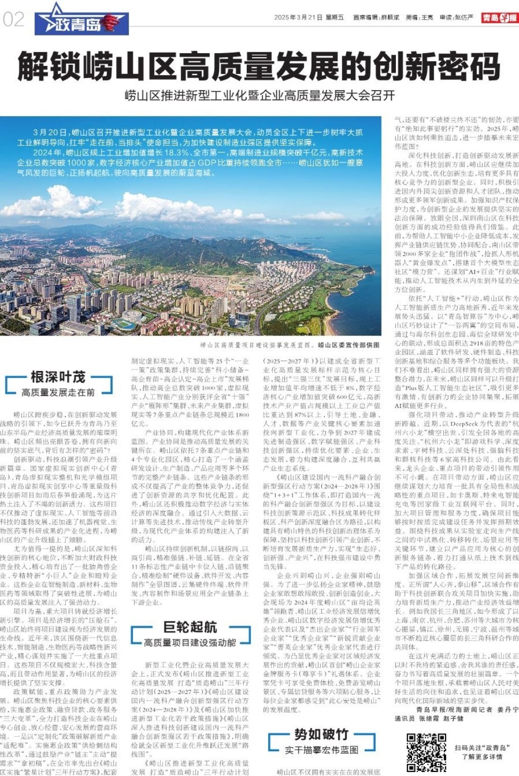 新型工业化暨企业高质量发展大会上,正式发布《崂山区推进新型工业化高质量发展 打造“质造崂山”三年行动计划(2025—2027年)》《崂山区建设国内一流科产融合创新型强区行动方案(2024—2028年)》及《崂山区加快推进新型工业化若干政策措施》《崂山区深入推进科技创新建设国内一流科产融合创新型强区若干政策措施》,明确绘就全区新型工业化升维跃迁发展“路线图”。