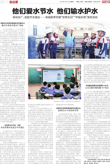 活动现场,一排摆放整齐的节水护水宣传展板,图文并茂地展示着“世界水日”“中国水周”的由来、西海岸新区水资源现状、污水处理流程以及节约用水小常识等内容。日常使用的自来水是怎么来的?满怀期待的学生们跟随工作人员的脚步,深入高家台水厂参观。“大家看,进入这里的每一滴水,都要经过混凝、沉淀、过滤、消毒等工序。不仅如此,还要经过多次严格的水质检测与监测,只有完全符合标准,才能成为可供大家放心使用的自来水。”高家台水厂厂长张元友介绍,处理后的水会储存在清水池,随后通过加压泵房送往千家万户。而污水处理同样复杂,需依次经过格栅处理、初沉池过滤杂质、活性污泥氧化处理、混凝沉淀处理,达标后方可排放。“原来我们喝的水要经过这么多道工序啊,以后我要珍惜每一滴水,绝不浪费。”学生王熙晗说。