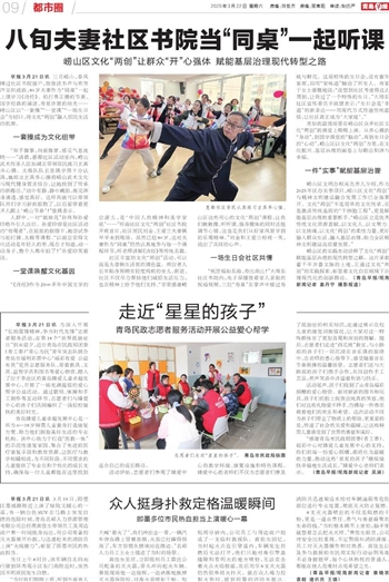 早报3月21日讯 三月崂山,春风拂过社区书院窗户,琅琅读书声与欢笑声交织成曲,80岁夫妻作为“同桌”一起上课学习《诗经》。拍打养正操的节奏、国学经典的诵读、寿星许愿的烛光……崂山区以“一套操”“一堂课”“一场生日会”为切口,将文化“两创”融入居民生活的肌理。