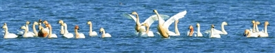 作为莱西市拍鸟的知名摄影师,于考臣和同伴们每年都要跟踪拍摄白天鹅的行踪。3月18日,他又一次拍到了白天鹅飞抵莱西湖的倩影。“这几年,越来越多的白天鹅在往南方越冬和春季北归途中,把莱西湖作为重要‘驿站’,停留补充能量。往年有30多只白天鹅光临莱西湖,没想到今年一下子飞来了60多只。”于考臣介绍,开始他只发现有几只白天鹅在湖面上戏水,后来几天看到成群结队的白天鹅出现在浅水区觅食。在一连跟踪了一周时间后,于考臣拍到了60多只白天鹅在莱西湖湖面上翩翩起舞的壮观画面。