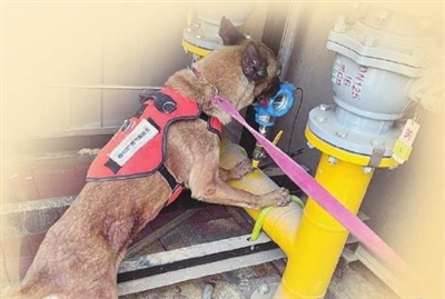 嗅到泄漏点后立定不动“发信号”,嗅探犬选拔严格,要经过至少1年训练才能上岗,训练期间定期“考核”,一般10只中只有一两只能进入实战