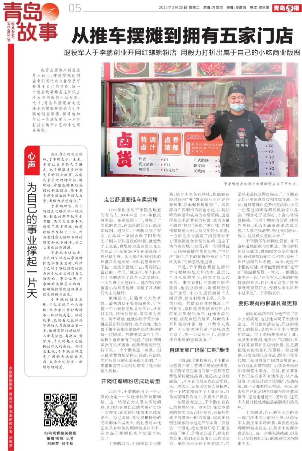 在青岛西海岸新区这片土地上,怀揣梦想的创业者们用汗水与智慧书写着属于自己的传奇,每一个创业故事都是这片沃土活力与创新的生动写照。近日,青岛早报记者走进濠小姐螺蛳粉创始人于李鹏的创业世界,探寻他如何从一名退役军人一步步打拼出属于自己的小吃商业版图。