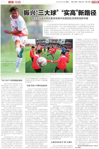 不久前国家体育总局局长高志丹接受采访时表示,力争在“三大球”等项目上取得实质性突破。近日,青岛实验高中围绕“三大球高质量发展”连续召开两次专题座谈会,下一步将在“三大球”教学实践中实施以足球为引领的创新举措。青岛实验高中校长石华军表示:“足球不仅是竞技运动,更是一种教育载体。青岛实验高中实施以足球为突破口的‘三大球’创新,就是要让每一个热爱足球的孩子都能‘踢’进理想学府,‘踢’出精彩人生!”