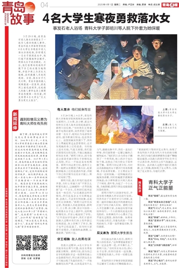 3月29日晚,在青岛石老人海水浴场发生了一起令人感动的救人事件。青岛科技大学体育学院的4名大学生当晚在石老人海水浴场赶海,恰好遇见一名女子栽倒在水中,他们毫不犹豫地伸出援手,将落水女子成功救起。之后,他们在寒冷的海风中脱下自己的衣服为她保暖,并在沙滩上为其生火取暖,直到救援人员赶到现场。目前,落水女子已无大碍。青岛早报的救人视频报道一经发布,就在网上被迅速刷屏,这起感人的救人事件也登上微博青岛热搜第一的位置,网友称赞4名大学生“见义勇为更见义智为”。