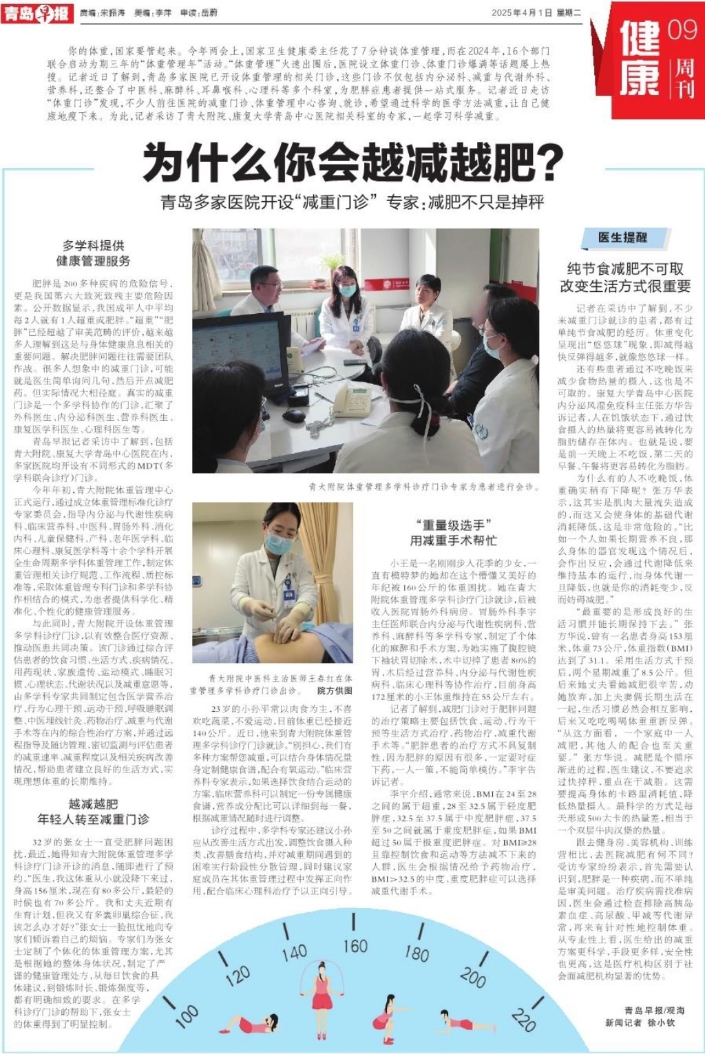 你的体重,国家要管起来。今年两会上,国家卫生健康委主任花了7分钟谈体重管理,而在2024年,16个部门联合启动为期三年的“体重管理年”活动。“体重管理”火速出圈后,医院设立体重门诊、体重门诊爆满等话题屡上热搜。记者近日了解到,青岛多家医院已开设体重管理的相关门诊,这些门诊不仅包括内分泌科、减重与代谢外科、营养科,还整合了中医科、麻醉科、耳鼻喉科、心理科等多个科室,为肥胖症患者提供一站式服务。记者近日走访“体重门诊”发现,不少人前往医院的减重门诊、体重管理中心咨询、就诊,希望通过科学的医学方法减重,让自己健康地瘦下来。为此,记者采访了青大附院、康复大学青岛中心医院相关科室的专家,一起学习科学减重。