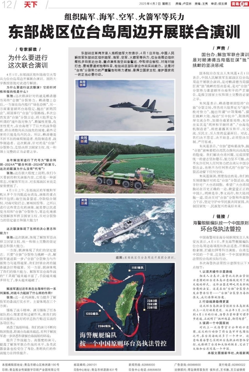 东部战区新闻发言人施毅陆军大校表示,4月1日开始,中国人民解放军东部战区组织陆军、海军、空军、火箭军等兵力,位台岛周边组织舰机多向抵近台岛,重点演练海空战备警巡、夺取综合制权、对海对陆打击、要域要道封控等科目,检验战区部队联合作战实战能力。这是对“台独”分裂势力的严重警告和有力遏制,是捍卫国家主权、维护国家统一的正当必要行动。