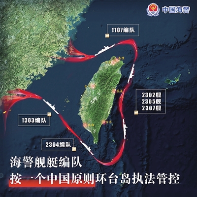 中国海警局东海分局新闻发言人朱安庆表示,4月1日,多支海警舰艇编队位台岛周边海域组织执法巡查,开展临检拿捕、拦截扣押等科目演练。台湾是中国的一个省,这是按一个中国原则依法管控台岛的实际行动。