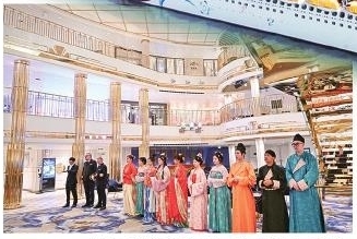 “爱达·魔都”号邮轮上的工作人员在大厅迎客。