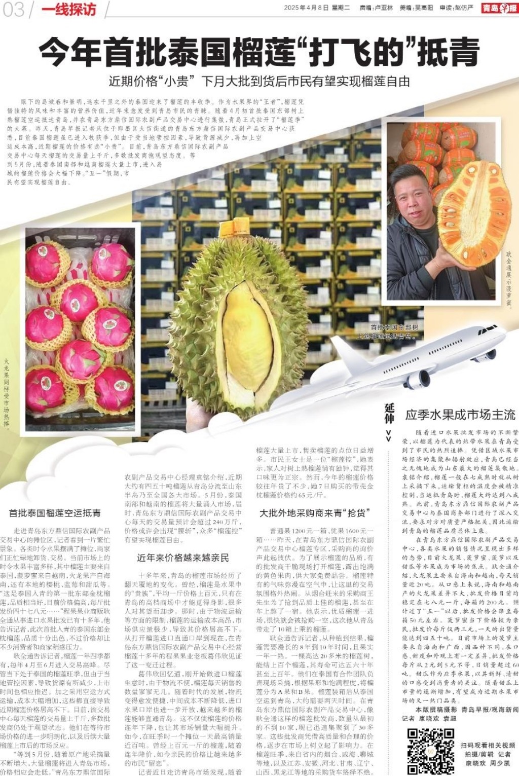 眼下的岛城春和景明,远在千里之外的泰国迎来了榴莲的丰收季。作为水果界的“王者”,榴莲凭借独特的风味和丰富的营养价值,近年来愈发受到青岛市民的青睐。随着4月初首批泰国东部树上熟榴莲空运抵达青岛,并在青岛东方鼎信国际农副产品交易中心进行集散,青岛正式拉开了“榴莲季”的大幕。昨天,青岛早报记者从位于即墨区大信街道的青岛东方鼎信国际农副产品交易中心获悉,目前泰国榴莲虽已进入收获季,但由于受当地管控因素,导致货源减少,再加上空运成本高,近期榴莲的价格有些“小贵”。目前,青岛东方鼎信国际农副产品交易中心每天榴莲的交易量上千斤,多数批发商抱观望态度。等到5月份,随着泰国南部和越南榴莲大量上市,进入岛城的榴莲价格会大幅下降。“五一”假期,市民有望实现榴莲自由。