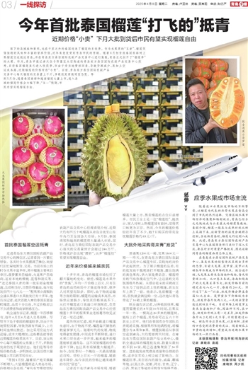 随着进口水果批发市场的不断繁荣,以榴莲为代表的热带水果在青岛受到了市民的热烈追捧。凭借区域水果市场经济的集聚和辐射效应,青岛已经当之无愧地成为山东最大的榴莲集散地。袁铭介绍,榴莲一般在七成熟时就从树上采摘下来,运输货柜的温度会被精准控制,当运抵青岛时,榴莲大约达到八成熟。此前,青岛东方鼎信国际农副产品交易中心与泰国商务部门进行了深入交流,要求对方对质量严格把关,因此运输到青岛的榴莲品质总体上乘。