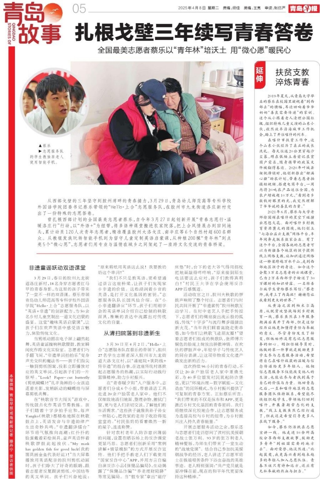 曾扎根西部计划的全国最美志愿者蔡乐,自今年3月27日起创新开展“青春志愿行·温暖洛庄行”行动,以“外语+”为纽带,将多语种课堂搬进农家院落,把上合风情展办到田间地头,累计动员120人次青年志愿者,精准覆盖胶州大洛戈庄、南辛庄等6个自然村超600名群众。从教银发族玩转智能手机到为留守儿童定制英语启蒙课,从种植200棵“青年林”到点亮5个“微心愿”,志愿者们用专业与温情在城乡之间架起了一座跨文化交流的青春桥梁。