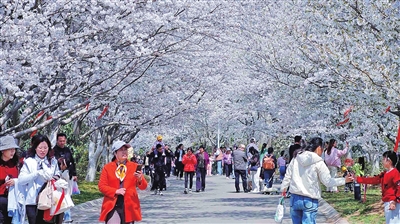 西海岸新区张家楼街道画美达尼乡村振兴片区樱花盛开吸引游客流连忘返。