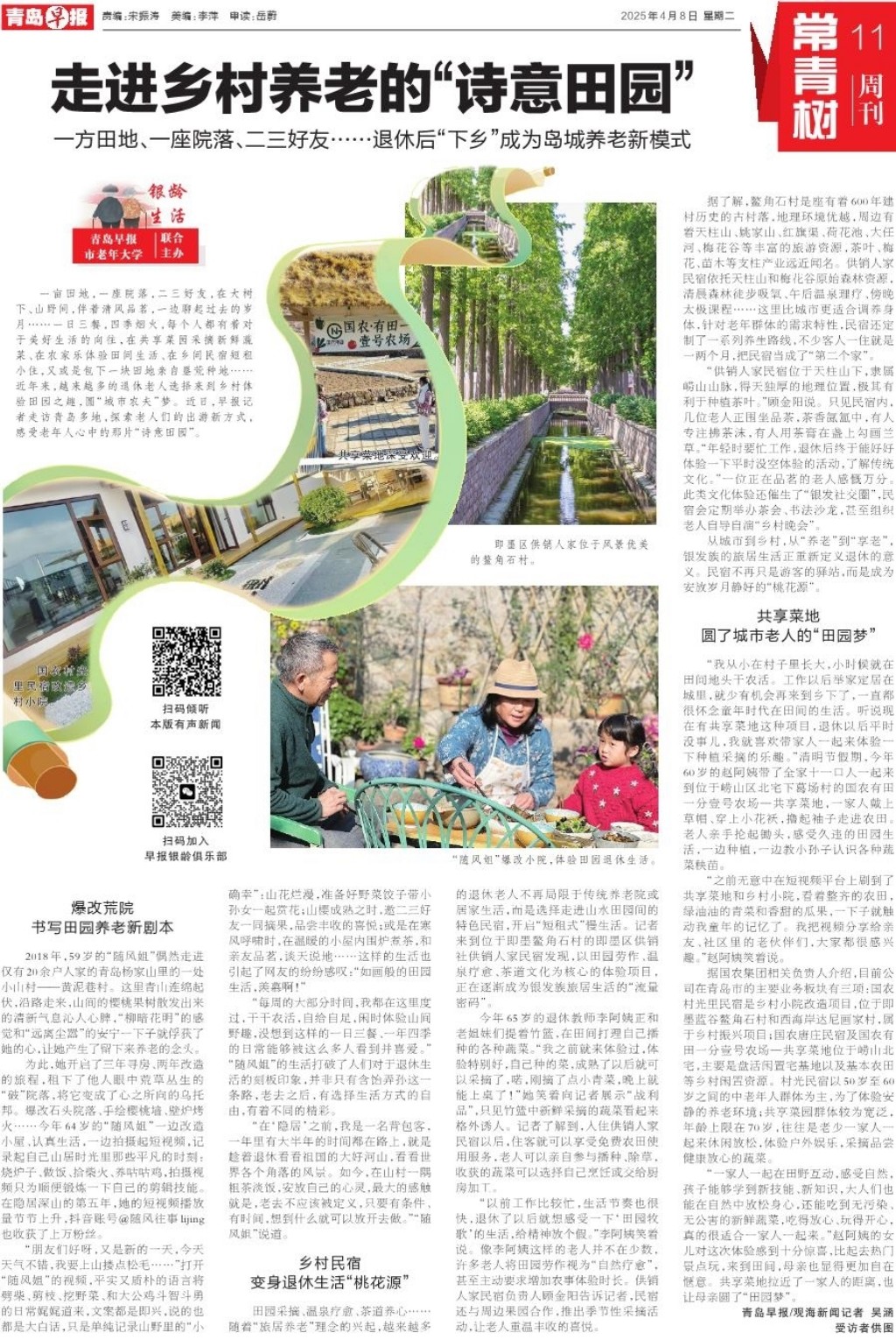 一亩田地,一座院落,二三好友,在大树下、山野间,伴着清风品茗,一边聊起过去的岁月……一日三餐,四季烟火,每个人都有着对于美好生活的向往,在共享菜园采摘新鲜蔬菜、在农家乐体验田间生活、在乡间民宿短租小住,又或是包下一块田地亲自垦荒种地……近年来,越来越多的退休老人选择来到乡村体验田园之趣,圆“城市农夫”梦。近日,早报记者走访青岛多地,探索老人们的出游新方式,感受老年人心中的那片“诗意田园”。