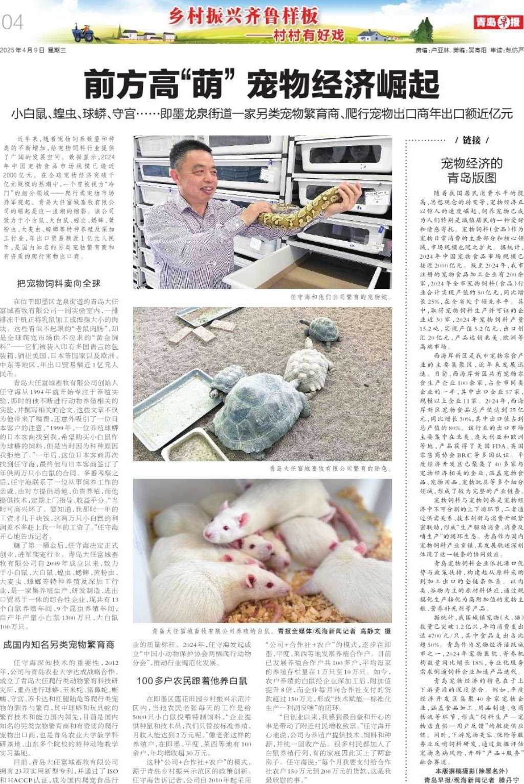 目前,青岛大任富城畜牧有限公司拥有23项实用新型专利,并通过了ISO和HACCP认证,成为国内爬宠食品行业的质量标杆。2024年,任守海发起成立“中国小动物保护协会两栖爬行动物分会”,推动行业规范化发展。