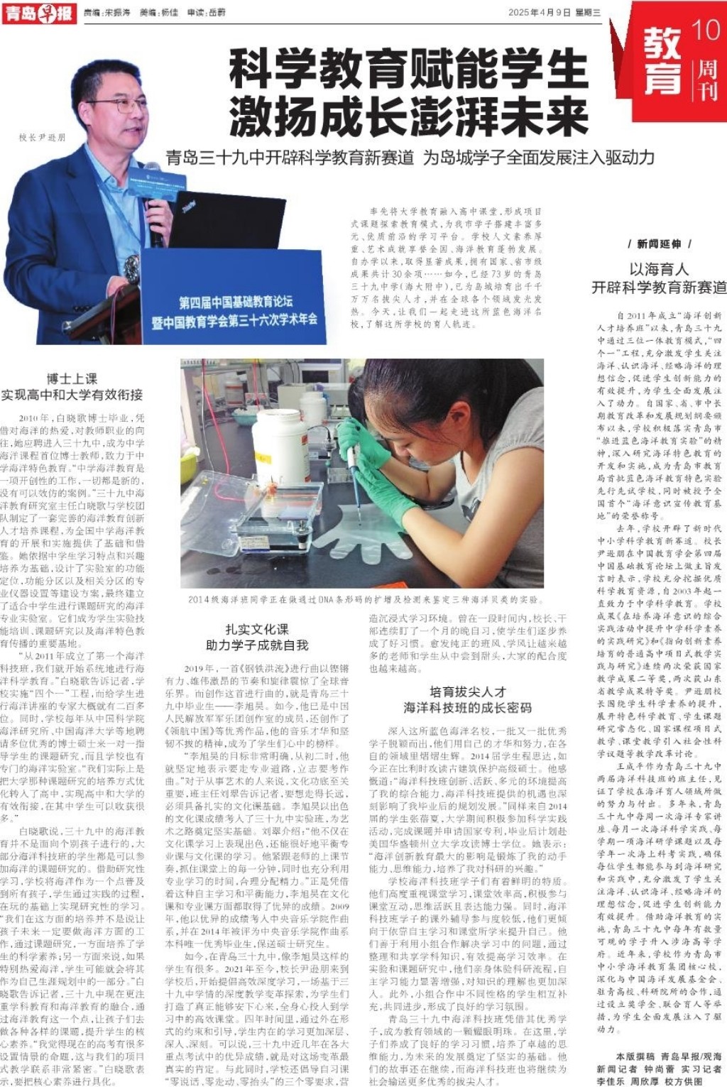 王成平作为青岛三十九中两届海洋科技班的班主任,见证了学校在海洋育人领域所做的努力与付出。多年来,青岛三十九中每周一次海洋专家讲座、每月一次海洋科学实践、每学期一项海洋研学课题以及每学年一次海上科考实践,确保每位学生都能参与到海洋研究和实践中,充分激发了学生关注海洋、认识海洋、经略海洋的理想信念,促进学生创新能力有效提升。借助海洋教育的实施,青岛三十九中每年有数量可观的学子升入涉海高等学府。近年来,学校作为青岛市中小学海洋教育集团核心校,深化与中国海洋发展基金会、驻青高校、科研院所的合作,通过设立奖学金、联合育人等举措,为学生全面发展注入了驱动力。
