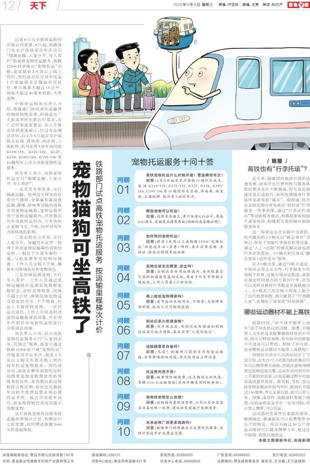 中铁快运相关负责人介绍,铁路部门持续深化运输供给侧结构性改革,积极适应广大旅客多样化的出行需求,在广泛听取旅客意见、深入开展市场调查基础上,经过专业测试评估,自4月8日起在京沪高铁北京南、济南西、南京南、上海虹桥、杭州东等5座车站间的G119/118、G121/122、G127、G134、G183/184、G195/196等10趟列车上试点高铁宠物托运服务。