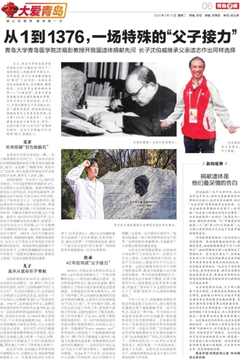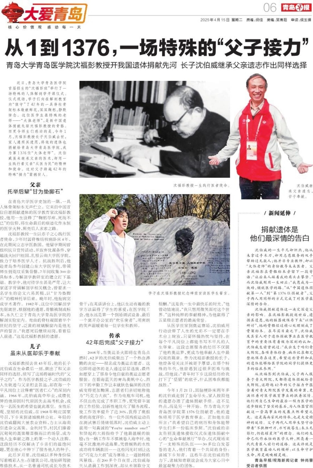 从沈福彭到沈伯威,父子两人服务于青大附院,又都将遗体捐献给青大附院,这跨越42年的父子接力中蕴含着对青大附院医学发展的希冀,更满怀着对医学教育事业的执着深情。他们用自己生命的最后一程为医学的进步铺就了坚实的基石,为人体器官捐献这一崇高事业的发展点燃希望之光。这是高尚家风的传承,也是大爱精神的延续。父子两代人用毕生坚守诠释着“不执柳叶刀,亦可救苍生;未立无影灯,仍能耀星河”的理念。他们的生命已化作永恒的医学火种,照亮着一代代青医人前行的道路。这或许就是医学教育最动人的模样:以生命守护生命,用灵魂唤醒灵魂。