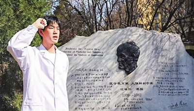 学子在沈福彭教授纪念碑前宣读医学生誓言。