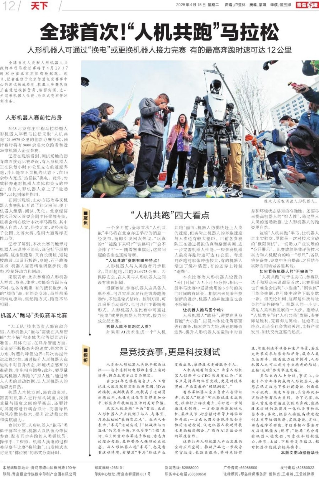 “人机共跑”对于主办方、参赛队选手和观众来说都是首次,比赛期间也许难免会出现“小插曲”,“钢铁侠”可能会摔倒,也可能中途停下脚步歇一歇。但无论如何,这都是科技与社会的“良性碰撞”。机器人的一小步,将是人类科技发展的一大步。推动从“人机共生”向“人机共荣”发展,参赛即是胜利,完赛即是英雄。这绝不是终点,而是全社会共同关注,支持产业发展、加快交流互鉴的起点。
