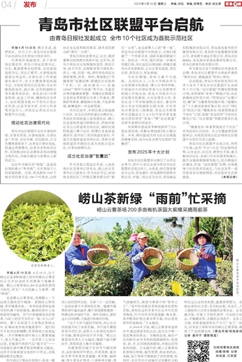 早报4月15日讯 4月15日,位于崂山区金家岭街道王家村的崂山云雾茶场正式开启2025年雨前茶大规模采摘。崂山云雾茶场以200余亩有机茶园为依托,将为广大市民献上今春第一缕“鲜爽”。