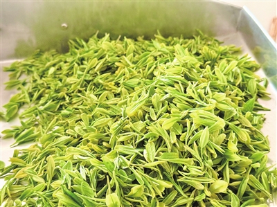 阳光透过云雾洒在茶园中,绘成一幅动人的田园风光画。采茶工人一边采摘,一边谈论着今年茶树的长势。随着竹篓里的茶叶越来越多,整个茶园都弥漫着一种满足和幸福的气息。茶叶采摘后,要经过6小时晾晒,才能进行标准化炒制。