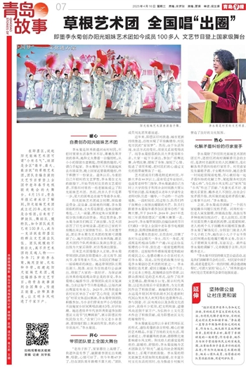 在即墨区,说起阳光姐妹艺术团可谓“小有名气”,该团是全区“最早、最大、最活跃”的草根艺术团,团队自编自演的文艺节目曾登上全国中老年春节电视联欢晚会的大舞台。4月15日,青岛早报记者采访了解到,阳光姐妹艺术团成立近20年,起初只是合唱团,后来有了锣鼓队、舞蹈队、模特队,如今团队成员已有100多人,成为一支活跃在即墨区的群众文艺演出队伍。团队规模的不断壮大,离不开艺术团的灵魂人物——今年71岁的李永菊,她用坚韧、无私和辛劳,组建起阳光姐妹艺术团,通过编排各种文艺节目,将青岛故事演到全国舞台,传递正能量,诠释真善美,让文明乡风吹进了千家万户。