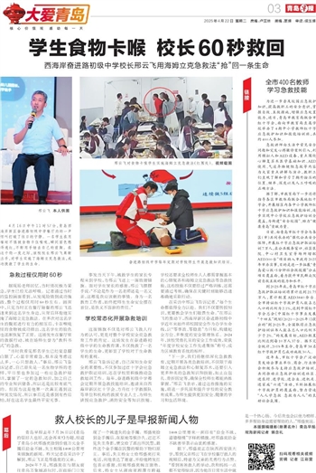 4月16日中午11时57分,青岛西海岸新区奋进路初级中学餐厅内的一声惊叫打破了往日的宁静。一名学生在用餐时不慎被食物卡住喉咙,瞬间面色憋得通红,不断用手锤击自己的前胸。在这千钧一发之际,该校校长邢云飞果断出手,对学生实施了海姆立克急救法,成功挽救了学生的生命。