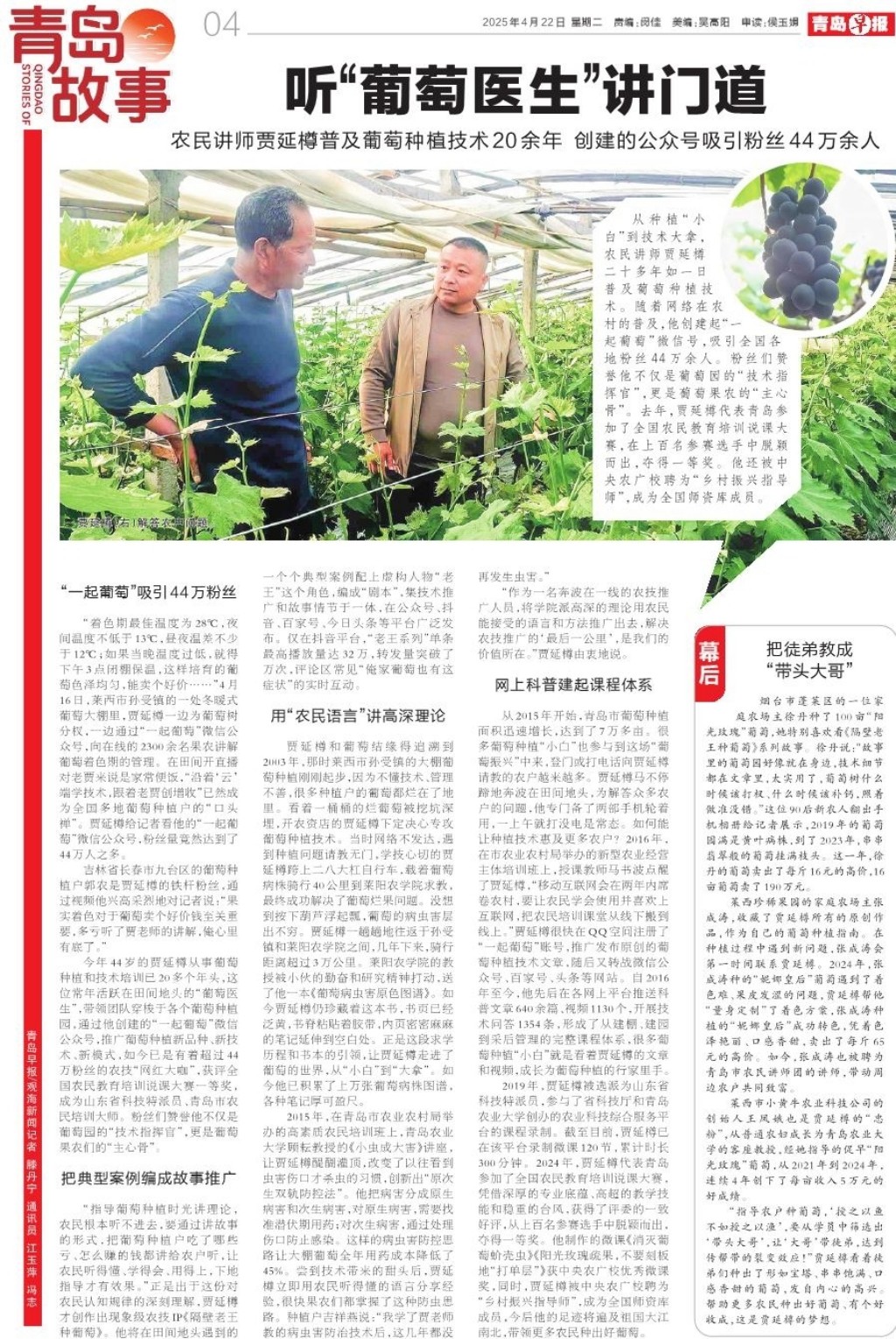 今年44岁的贾延樽从事葡萄种植和技术培训已20多个年头,这位常年活跃在田间地头的“葡萄医生”,带领团队穿梭于各个葡萄种植园,通过他创建的“一起葡萄”微信公众号,推广葡萄种植新品种、新技术、新模式,如今已是有着超过44万粉丝的农技“网红大咖”,获评全国农民教育培训说课大赛一等奖,成为山东省科技特派员、青岛市农民培训大师。粉丝们赞誉他不仅是葡萄园的“技术指挥官”,更是葡萄果农们的“主心骨”。