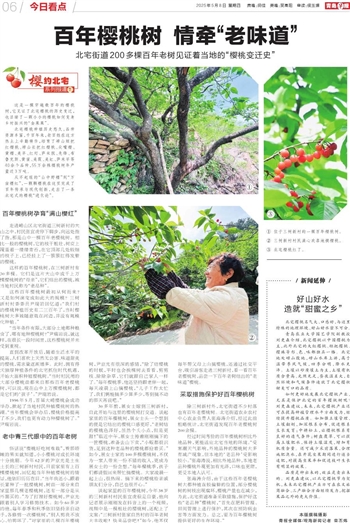 除三树新村外,北宅街道不少村落也有百年老樱桃树。北宅街道农业农村中心农业负责人张海涛介绍,经过此前粗略统计,北宅街道发现百年老樱桃树200余棵。