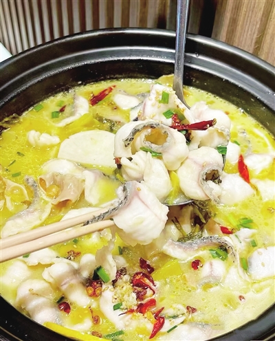 扒开表面漂浮的辣椒,潜入盆中,一块洁白透亮的鱼肉跃然而出,放入碗里剔去尖刺,喂进嘴里,细嚼慢咽。鲜活的鱼是这道菜的灵魂所在,黑鱼、草鱼等都可以。麻辣鲜香激发出人间烟火,软嫩细腻抚慰着劳苦奔波。吞捻吐刺,个中滋味交织在一起,那叫一个过瘾。