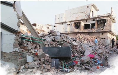 这是5月7日在巴基斯坦东部旁遮普省巴哈瓦尔布尔地区拍摄的遭印度导弹破坏的房屋。