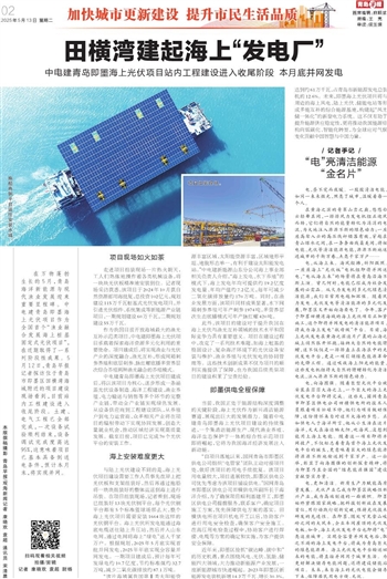 电,向海图强。随着巨型光伏平台被安装在茫茫大海之上,一个巨大的海上光伏发电平台即将完成。这些天,国网青岛市即墨区供电公司田横供电所的技术人员跟着项目忙碌不停,他们为项目做好保障,这份情怀来自对这片大海的乡愁。正如供电人于海洋所言,他从小生活在这片海洋,天天在海边晒太阳,吹海风,没想到能用上海上电能。随着这一项目即将并网投产,不仅标志着青岛首个海上光伏发电平台的诞生,更意味着巨大的绿色能源将源源不断地输送到千家万户。这一壮举,彰显了向海图强的创新探索精神,将为即墨乃至全国的“绿色能源强国”建设贡献坚实力量。