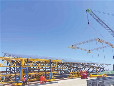 与陆上光伏建设不同的是,海上光伏项目建设需要工作人员事先在岸上把光伏板和支架组装好,然后再通过拖船将一块块组装好的整体运送到海上进行吊装。在项目组装现场,记者看到,现场已组装好13块光伏钢平台,每个光伏钢平台都有5个标准篮球场那么大,整个海上光伏项目需要安装1664块这样的光伏钢平台。海上光伏所发电能通过海底电缆送往陆上升压站,然后并入山东电网,通过电网将海上“绿电”送入千家万户。根据规划,2025年5月底实现首批并网发电,2025年年底实现全容量并网发电。一期项目建成后,预计每年可发绿电约10.7亿度,节约标准煤约32.7万吨,减少二氧化碳排放约87.1万吨。