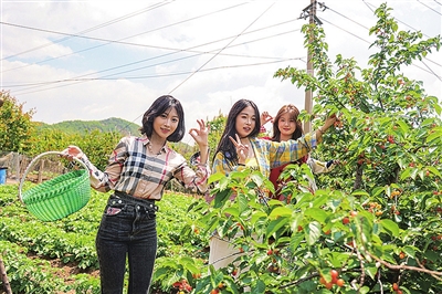 游客在张家楼街道樱皇谷景区采摘樱桃。西海岸新区供图