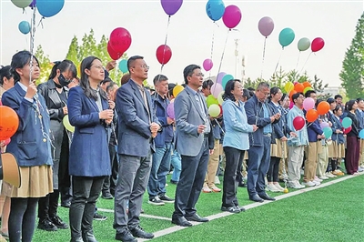 青岛二中举行“祝福高三 放飞气球”升旗仪式。