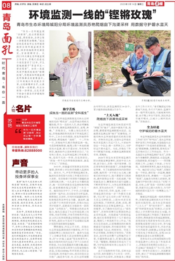 生态环境监测是生态环境管理工作的“耳目”和“哨兵”,是生态环境保护各项工作的基础,也是检验生态环境保护工作成效的重要依据。因此“数据准确,支撑管理,服务民生”是苏艳对自己工作的定位。作为一名基层生态环境监测的“老兵”,苏艳如今身兼数职,数据报送、应急监测、污染源排查、报告编写……一项项繁琐的工作,让她忙于奔波,少有空闲。但即便再累再苦,她从未抱怨过一句。她总是与自己“较真”,采集好每一个样品、做好每一次监测,确保数据的真实性、准确性……而这种“较真”,是她身为环保人的情怀,更是她守护绿水青山的信念。“实现‘天蓝、水绿、山青’是每一名环保人的愿景,我愿尽自己最大的努力,为守护城阳的碧水蓝天尽一份绵薄之力。”苏艳说。