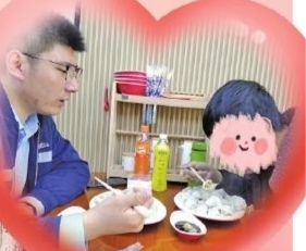 公交驾驶员薛宇山(左)带小田吃午饭。
