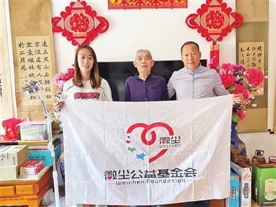 褚良恒老人(中)向青岛市微尘公益基金会捐款1000元。
