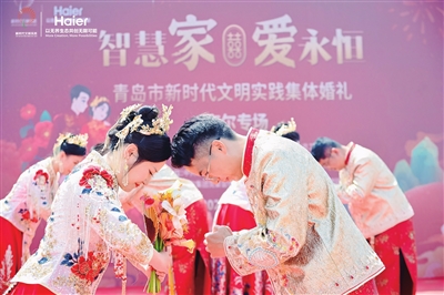 2020年5月,民政部启动婚俗改革试点,青岛市积极深化新时代结婚礼堂建设,契合当前移风易俗、婚事新办简办的风尚,甩掉“四大金刚”,抛开“堵门游戏”“闹婚”等冗杂环节,“喜事新办、新事简办”不仅反映了社会风气和公共价值导向的转变,也传递了文明婚俗的积极信号。