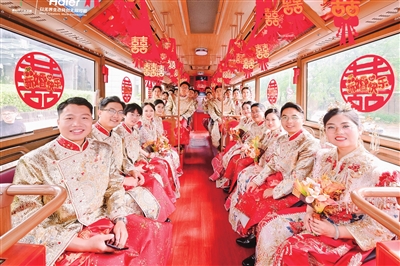 一场简约而不失隆重的集体婚礼背后,是青岛政企合作的精细化服务。从场地协调、流程设计到资源整合全程联动,为新人提供“一站式”体验:婚车接亲、妆造服务、市集打卡等环节无缝衔接;王哥庄花馍、AR云端祝福等细节,既保留民俗精髓,又融入现代创意。此次集体婚礼是政企携手倡树时代文明新风的延续,也是将传统文化与践行文明生活方式的结合。