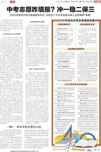 2025年青岛市初中学业水平考试网上志愿填报于5月22日8:00正式开启,针对志愿填报首日部分考生和家长提出的疑问,青岛早报记者采访了青岛市招生考试院工作人员,整理了一份中考志愿填报“秘籍”,助力每一位考生成功迈进理想学校。