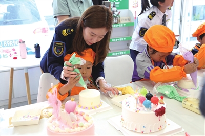 来到飘着黄油香的烘焙工坊,系上迷你围裙的孩子们在家长和专业糕点师的指导下化身“小小烘焙师”,在戚风蛋糕上“大展身手”,以奶油裱花、水果点缀创作“巴士车轮”“城市地标”等主题作品。“挤奶油要像给自行车打气一样,轻轻用力。”工作人员蹲在5岁的米米身边,手把手教她握裱花袋。米米妈妈举着手机记录这一刻:“宝贝别急,咱们的‘宝宝巴士’蛋糕要一点点画。”另一边,9岁的轩轩正用草莓片拼出红瓦屋顶:“这是我家旁边的老房子!”此时,陈光胜也戴上烘焙手套,小心翼翼地用巧克力酱描着线路号:“这个‘402’路可是我们主题巴士的专属线路!”现场笑声与奶香交织,亲子默契在指尖流淌。