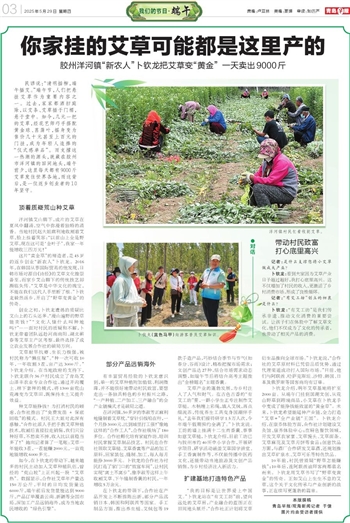 艾草产业的蓬勃发展,为乡村注入了人气和财气。在古色古香的“有艾工坊”里,一群小学生正专注制作艾草槌。木柄缠上彩绳,填入艾绒,再点缀流苏,传统养生工具变身国潮伴手礼。“去年我们接待研学1.5万人次,今年端午假期预约全满了。”卜钦龙说。工坊的墙上挂满十二生肖香囊、事事如意艾草槌,卜钦龙介绍,目前工坊已与胶州市约40所中小学合作,开展研学项目,研学活动涵盖艾草国学讲堂、手工香囊制作等,不仅能传播中医药文化,还能带动当地旅游及文创产品销售,为乡村经济注入新活力。