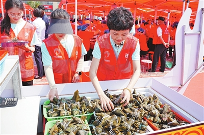 清晨的城阳村社区广场上,随着直径3米的巨型“团圆锅”的揭盖,包粽子大赛正式拉开帷幕,来自社区的1700多名参赛者展开技艺比拼,制作粽子6万余个。参赛选手年龄最小的4岁,最年长的88岁。经过激烈角逐,本届包粽子大赛共评选出20组“金粽奖”“银粽奖”获得者。社区志愿者将999只精选粽子分装成“孝心礼盒”,送往社区医养中心,为孤寡老人送去温暖关怀和节日祝福。